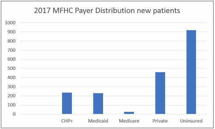 But a concerning trend has been showing up for Mountain Family: we would have hoped that, with the Affordable Care Act (ACA) and other changes nationally, most of our patients would have some form of insurance to help cover the cost of their care. Unfortunately, our data tells a different story. For the 1,869 new patients that we’ve had in the last year, please see the second chart below, showing how many did not have public or private insurance. (That slide is titled 2017 MFHC Payer Distribution new patients. The term “CHP+” is Child Health Plan Plus, Colorado’s insurance plan for certain kids and pregnant moms.)
