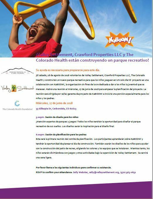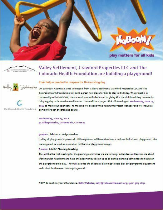 One of our partner organizations, Valley Settlement, is leading the effort to create a new, community-designed and community-built playground in El Jebel, sponsored by The Colorado Health Foundation. Approximately 250 volunteers are needed on Saturday, August 18th, to build the playground, serve food, and keep kids entertained. Volunteers must be 18 years or older to participate in the build and there will be activities for kids under 18.